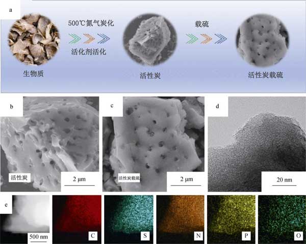 首先,除去生物質(zhì)的污垢和表面雜質(zhì),用清水徹底清洗活性炭原材料,然后用蒸餾水反復(fù)清洗,然后將它們粉碎成碎片,然后在烤箱中100°C下干燥。為了進(jìn)行預(yù)碳化,將干燥的生物質(zhì)在氮?dú)夥障碌恼婵展苁綘t中在500°C的溫度下熱解2小時(shí),以去除少量有機(jī)分子。隨后,為了通過化學(xué)活化提高比表面積,將預(yù)碳酸化的生物質(zhì)以1:4的重量比浸入作為化學(xué)活化劑的水溶液中,然后充分?jǐn)嚢?小時(shí)以確保完全滲透。之后,將混合物在N 2下于900°C退火1小時(shí)。最后,用鹽酸反復(fù)洗滌退火后的樣品,然后用過量的蒸餾水沖洗以獲得中性pH。最終樣品通過在80°C的空氣中干燥獲得,并標(biāo)記為多孔活性炭。相比之下,使用相同步驟制備的未添加活化劑的產(chǎn)品被標(biāo)記為無孔活性炭。接著使用這兩種活性炭升級(jí)成加硫復(fù)合材料,將升華后的硫(純度>99.95%)和相應(yīng)的活性炭粉末(重量比為60:40)充分混合并在研缽中研磨。然后,將獲得的混合物用特氟隆容器密封在高壓釜中。在155°C下熱處理12小時(shí)后,獲得了多孔摻硫活性炭和無孔摻硫活性炭復(fù)合材料。