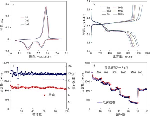為了評(píng)估活性炭作為陰極的電化學(xué)性能,將鋰箔作為陽(yáng)極組裝到鋰硫電池的紐扣電池中。用于第一,第二和第三個(gè)循環(huán)的循環(huán)伏安圖(CV)曲線上在0.05毫伏·秒的掃描速率的電位窗口進(jìn)行(圖2A)。在第一循環(huán)期間,觀察到兩個(gè)陰極峰在2.26和1.97 V,CV曲線中最初的幾個(gè)循環(huán)幾乎重疊,這表明循環(huán)穩(wěn)定性極佳,容量保持率相對(duì)較高;钚蕴康暮汶娏鞒潆/放電曲線和循環(huán)穩(wěn)定性的測(cè)試中,如在圖中所描述2B、C;钚蕴侩姌O的首次放電容量為1045 mAh·g -1,約為硫理論容量的62.5%。此外,活性炭電極在第100次循環(huán)時(shí)也顯示出869.8mAh·g -1的放電容量。如圖2d所示測(cè)量活性炭的倍率性能,在200–3200 mA·g -1下表現(xiàn)出1260、1050、806、513、290 mAh·g -1的可逆放電容量。此外,當(dāng)電流密度達(dá)到800 mA·g時(shí),活性炭陰極的放電容量為802 mAh·g -1。多孔活性炭材料表現(xiàn)出中等的鋰硫電池電化學(xué)性能,顯示出高性能鋰硫電池的潛力。
