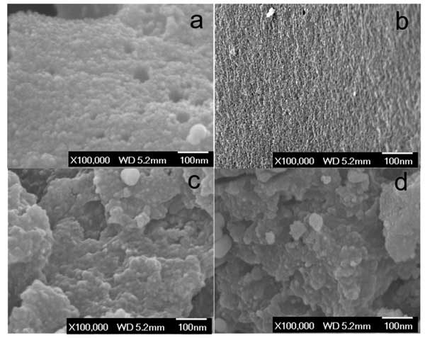 首先是電子顯微鏡,圖1顯示了活性炭(a),高溫活化后的活性炭(b),鎢浸漬活性炭(c)和鎢浸漬活性炭載鉑催化劑(d)的形態(tài)。SEM圖像(圖1a)顯示了在CO 2氣氛下在800℃下氣化的固體炭的形態(tài)。其多孔表面是由高溫下的CO 2蝕刻過(guò)程所貢獻(xiàn)的。高溫活化后的活性炭變得高度多孔,在1000°C碳化后,炭中形成了更多的孔和通道(圖2b)。鎢浸漬活性炭樣品中原始的活性炭結(jié)構(gòu)似乎消失了(圖1c),因?yàn)樵诟邷叵禄钚蕴亢脱趸u之間的碳熱還原反應(yīng)破壞了活性炭結(jié)構(gòu);钚蕴康谋诒砻媲度肓酥睆皆3到10 nm之間的納米粒子(圖1c),根據(jù)XRD結(jié)果,這意味著這些納米粒子應(yīng)為碳化鎢結(jié)構(gòu)。在鎢浸漬活性炭樣品中加入1.0%鉑后,表面形態(tài)無(wú)明顯變化(圖1d)。