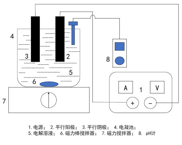 目前尚不知道電凝是否可以與活性炭吸附結(jié)合使用,作為從礦井廢水中去除硫酸鹽的可行新技術(shù)。所以我們來測試一下如圖1所示,使用有機玻璃反應器在720mL電凝電池(12×10×6cm)中進行活性炭吸附過程。鋁(純度≥99%)用作犧牲電極,不銹鋼用作陰極。每個電極板的有效面積為20cm2。平行的陽極和陰極垂直放置,并隔開一定距離。電極連接到數(shù)字直流電源,電壓和電流范圍分別為0-50V和0-5A。每次運行前,電極用細砂紙磨擦,先后用0.2M HCl和蒸餾水洗滌。對于每個實驗運行,將600mL礦井水放入電凝反應器中。使用磁力攪拌器不斷地(200rpm)攪拌溶液。將電流密度,電極間隙,初始pH和反應時間設(shè)置為期望值。通過添加0.1M HCl或0.1M NaOH來調(diào)節(jié)pH,并使用pH計進行測量。所有運行均在室溫(20°C)下進行。