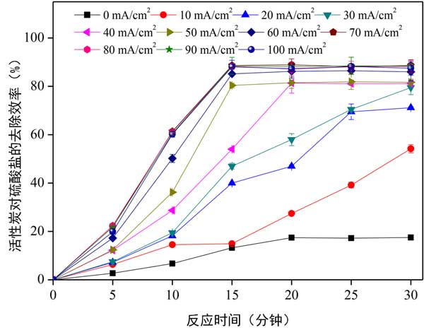 電流密度是一個關(guān)鍵參數(shù),它不僅影響凝結(jié)劑的用量,還影響氣泡的形成速率,氣泡的大小和絮凝物的生長。各種選定的電流密度:0、10、20、30、40、50、60、70、80、90和100mA/cm2在批量實驗中應用了,以建立電凝與活性炭耦合過程的有利電流密度范圍。在30分鐘的反應時間下使用鋁不銹鋼陽極/陰極電極對進行連續(xù)電凝工藝,并使用反應器中的活性炭濃度為0.2g/L來研究電流密度對硫酸鹽的影響去除效率。與活性炭吸附工藝相比,電凝加活性炭即使在低電流密度(10mA/cm2)時也可以顯著提高去除效率。如圖2所示,活性炭吸附過程和電凝活性炭吸附偶聯(lián)過程的去除效率在5分鐘時分別為2.7%和6.3%,在30分鐘時分別為17.5和54.2%。由于偶合體系中的反應比簡單的活性炭吸附過程更復雜,因此去除效率有所提高。電凝結(jié)合活性炭吸附對硫酸鹽去除效率有重要影響。結(jié)果表明,去除效率隨著電流密度的增加而顯著提高。電流密度為70mA/cm2時,去除效率最高(88.9%)。這種現(xiàn)象可以歸因于這樣的事實,即在高電流密度下,氧化金屬的數(shù)量增加,從而導致大量的Al(OH)3(s)顆粒有利于去除污染物。