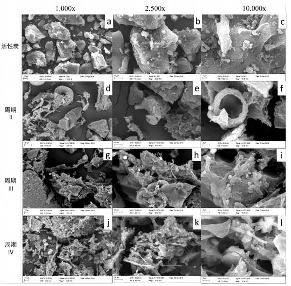 觀察圖3所示的圖像,處理期間生物量顯著增加,其中存在大量生物材料,可能的絲狀形成和微生物團(tuán)聚,表明存在較大量步驟IV中的生物量。至于生物膜的發(fā)展,觀察顯微照片增加了10,000倍(圖3C,3I和3L),注意到附著在活性炭表面的微生物的生長。這些可能是細(xì)菌,真菌和絲狀細(xì)菌,活性炭在反應(yīng)器運(yùn)行110天后,固體樣品中的細(xì)菌含量更高。