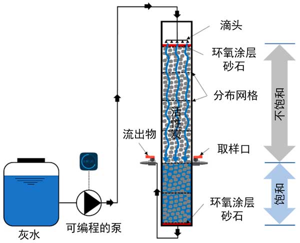 圖1:用于灰水處理的實驗室規(guī)模的單級不飽和飽和活性炭濾池的示意圖。