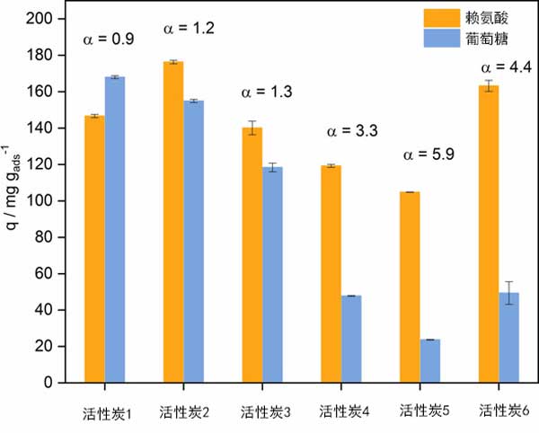 重要的是要了解吸附過程的選擇性,因為賴氨酸是通過葡萄糖的發(fā)酵以工業(yè)規(guī)模生產(chǎn)的,并且存在不同成分的混合物。作為模型溶液,使用了等效質(zhì)量的賴氨酸和d-葡萄糖的混合物。保持濃度低于單模型溶液的濃度,以抑制不希望的反應。圖2顯示了活性炭的競爭性吸附性能。 單組分吸附對賴氨酸的吸附能力相對較高,而與活性炭的各自特性無關(guān)。在多組分吸附中,考慮到吸附的選擇性,活性炭表面性能的影響變得更加明顯。發(fā)現(xiàn)選擇性與表面氧基團的數(shù)量相關(guān),因為較高的氧基團轉(zhuǎn)化為對賴氨酸的較高的選擇。