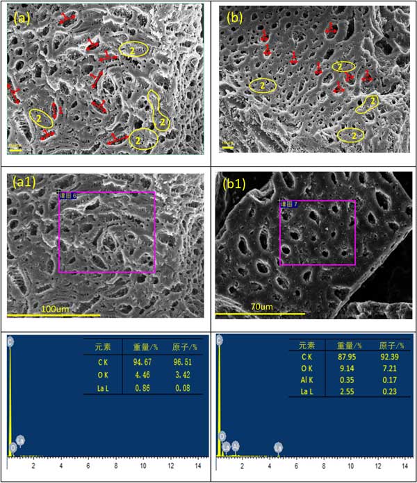 通過掃描電子顯微鏡(SEM)來顯示樣品的微觀形態(tài)和相應(yīng)的能量色散光譜(EDS)圖像,以證明鑭或鋁在兩種金屬上的成功加載的活性炭,在合適條件下制備。鑭改性活性炭和鑭鋁改性活性炭的SEM圖像如圖2所示。在圖2a中,有許多橢圓形孔標(biāo)記為1。鑭改性活性炭的表面較粗糙,而較細(xì)的多孔結(jié)構(gòu)則標(biāo)記為2。但是,鑭鋁改性活性炭的孔結(jié)構(gòu)在圖3b中進(jìn)行了更改。標(biāo)記為1的孔結(jié)構(gòu)變得更規(guī)則圓,標(biāo)記為2的細(xì)孔尺寸變大,并且孔分布更均勻,這適合更好的吸附能力。從圖2a1,a2和b1,b2中的樣品中檢測(cè)到元素鑭和鋁的存在。鑭的重量百分比為0.86%,經(jīng)過鑭(NO3)3·2H2O和率(NO3)3的改性后,明顯增加至2.55%。更多鑭的含量將顯示出更好的吸附性能,這可能是由于兩種元素在改性過程中的協(xié)同作用所致。