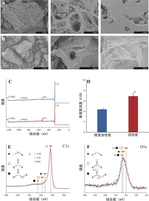 圖1:(A)欖殼活性炭和(B)活性炭在一系列放大倍數(shù)下的SEM顯微照片,(C)XPS調(diào)查掃描,(D)表觀氧元素濃度,(E)碳信號(hào),(F)氧濃度之間的顯著差異。