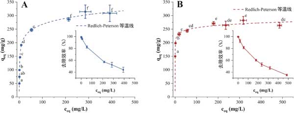 圖2:在(A)欖殼活性炭(B)活性炭上進(jìn)行羥基酪醇吸附的吸附等溫線的實(shí)驗(yàn)數(shù)據(jù)。