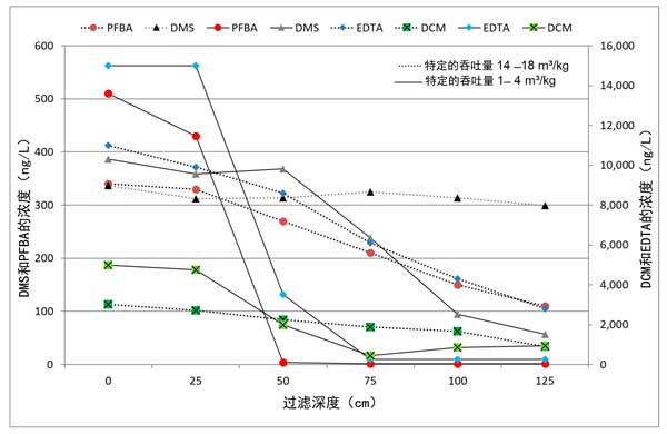 圖2:活性炭過濾器中痕量有機污染物的深度依賴濃度曲線。
