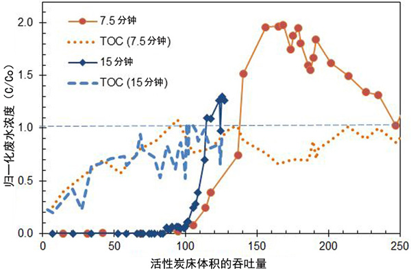 空床接觸時(shí)間對突破的影響說明如下:圖2用于123-三氯丙烷。盡管7.5分鐘和15分鐘EBCT的123-三氯丙烷突破的開始是相似的,但在100,000床體積之后,與7.5分鐘EBCT相比,15分鐘EBCT的突破更早。更長的EBCT容量降低可能是活性炭結(jié)垢的結(jié)果,這是由于更強(qiáng)的吸附力和不可置換的DOM到達(dá)吸附床的更深處,并超過了目標(biāo)有機(jī)物的吸附位點(diǎn)和/或覆蓋了活性炭顆粒的孔而導(dǎo)致的。時(shí)間并防止進(jìn)一步的目標(biāo)有機(jī)物吸附。通過比較相似突破點(diǎn)的吞吐能力差異,說明了EBCT對其他cVOC的活性炭性能的影響,其中負(fù)值表示在15分鐘EBCT時(shí)容量更大,正值表示在7.5分鐘EBCT時(shí)容量更大(或在15分鐘EBCT時(shí)容量較小)。床體積數(shù)量達(dá)到突破的10%,50%或75%的平均容量差異(不包括VC,因?yàn)槲丛u估15分鐘EBCT)分別為-0.1%,9%和13%,表明在運(yùn)行時(shí)容量沒有損失。15分鐘的EBCT突破了10%,突破了適度的容量,因?yàn)楦L的EBCT結(jié)垢了,因此突破了50%和75%。