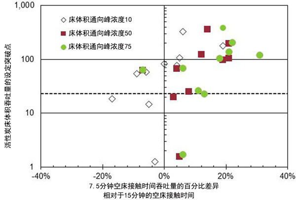 圖2:空床接觸時(shí)間對吞吐率的影響達(dá)到10%,50%和75%的突破。