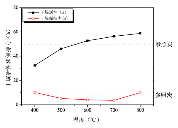圖2:活性炭的丁烷工作容量能力隨各種磷酸活化溫度的變化而變化。