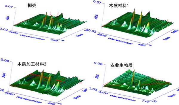圖1:四種生物質(zhì)樣品熱解過(guò)程中氣態(tài)產(chǎn)物的3D FTIR吸收光譜。