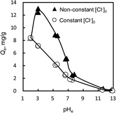活性炭上的硝酸根離子吸附量與溶液的pH e之間的關(guān)系如圖1所示。硝酸根離子在堿性條件下幾乎不被吸附,這意味著氫氧根離子會抑制硝酸根離子的吸附。另一方面,隨著平衡pH的降低,硝酸根離子的吸附量增加。在堿性條件下,由于硝酸根離子與活性炭表面之間的靜電排斥,硝酸根離子很難被吸附在活性炭上。另一方面,硝酸根離子的吸附量在酸性條件下增加,這歸因于硝酸根離子與碳表面之間的靜電吸引力。然而,隨著平衡pH從3.0降低到2.0,觀察到硝酸根離子吸附的顯著降低。在此pH范圍內(nèi),氯離子的初始濃度從2 m增加到20 m M,這意味著共存的氯離子會抑制硝酸根離子的吸附。通過NaCl溶液將氯離子的初始濃度固定在20 m M時(shí),可以清楚地發(fā)現(xiàn)氯離子對硝酸根離子的吸附抑制作用,表明硝酸根離子在所有pH區(qū)域的吸附量均低于沒有任何pH調(diào)節(jié)的溶液。因此共存陰離子會導(dǎo)致競爭吸附影響硝酸根離子吸附的效果,并且這種作用可能是較強(qiáng)的在共存陰離子的濃度較高。